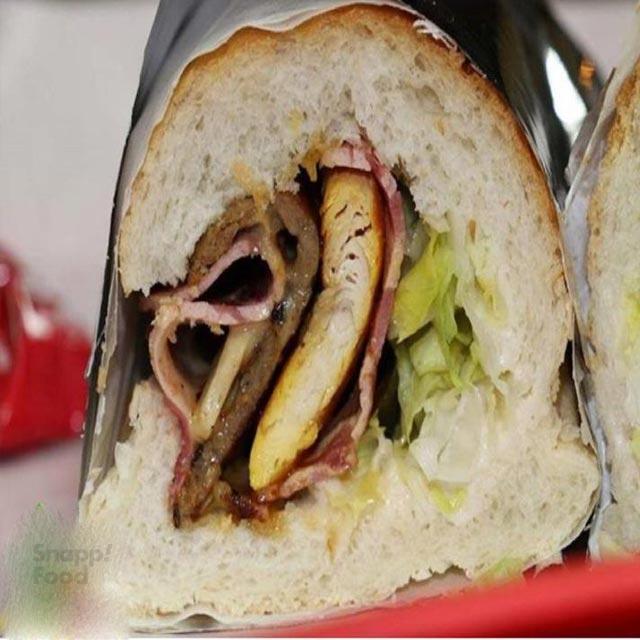 ۱۲۰ گرم برگر گوشت خالص، فیله مرغ، ژامبون ۹۰ درصد، قارچ، پنیر، کاهو، گوجه فرنگی، خیارشور، سس مخصوص، نان باگت