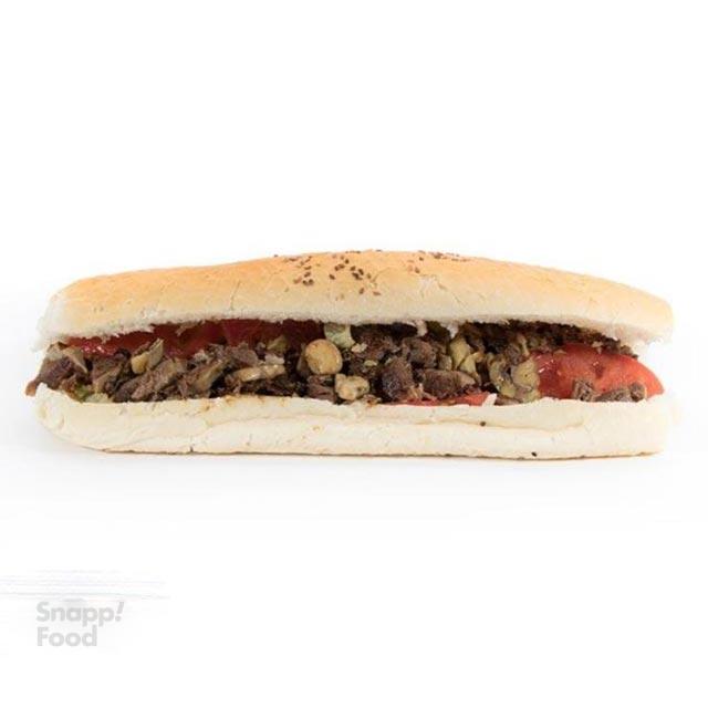 ۱۸۰ گرم زبان گوساله، قارچ، پنیر، کاهو، گوجه فرنگی، خیارشور، سس مخصوص، نان باگت