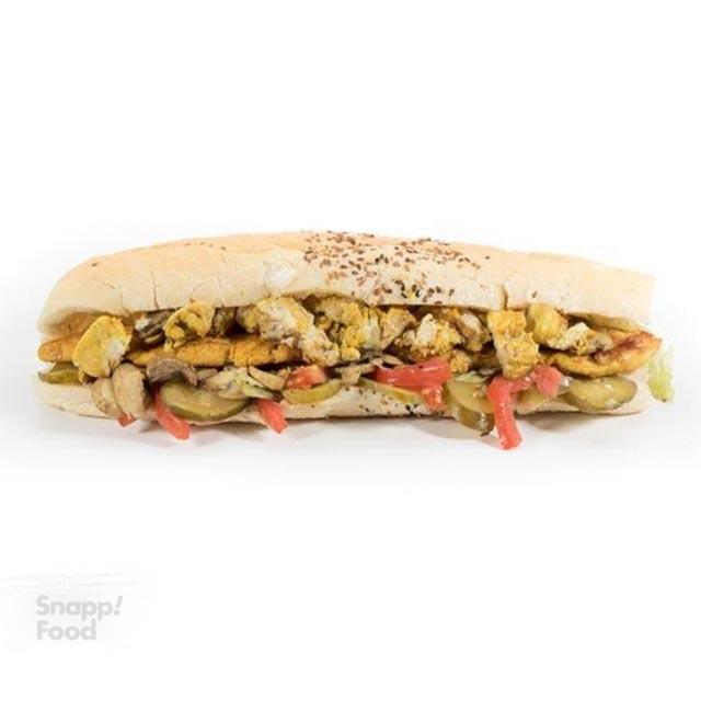 فیله مرغ، مغز گوساله، قارچ، پنیر، کاهو، گوجه فرنگی، خیارشور، سس مخصوص، نان باگت