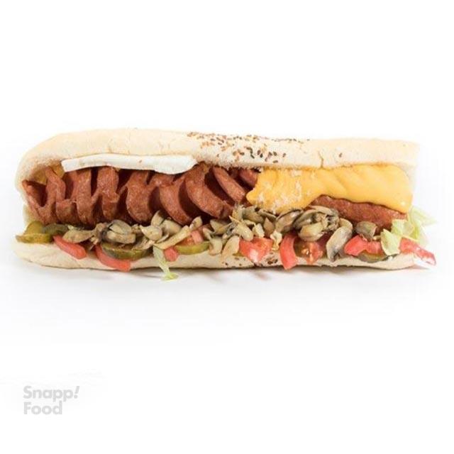 هات داگ ۹۰%، قارچ، پنیر، کاهو، گوجه فرنگی، خیارشور، سس مخصوص، نان باگت