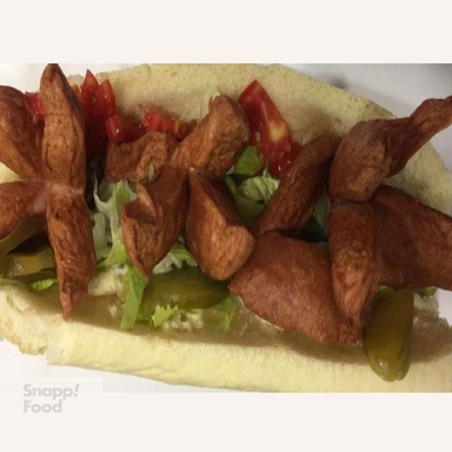 کوکتل دودی، کاهو، گوجه فرنگی، خیارشور، سس مخصوص، نان باگت