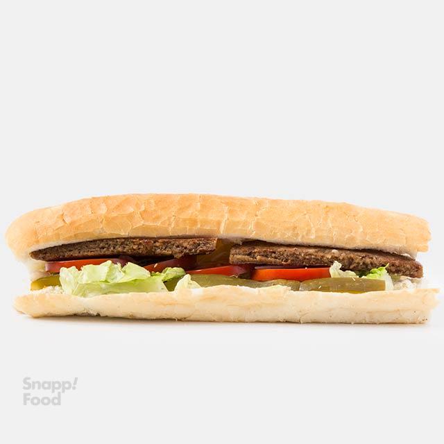 ۲۴۰ گرم برگر گوشت، کاهو، گوجه فرنگی، خیارشور، سس مخصوص، نان باگت